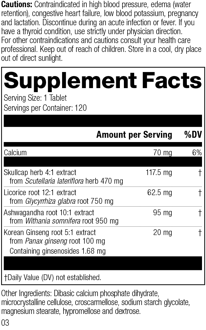 Each Serving Size (1 Tablet) contains: Calcium 70 mg, Skullcap herb 4:1 extract 117.5 mg (from Scutellaria lateriflora herb 470 mg), Licorice root 12:1 extract 62.5 mg (from Glycyrrhiza glabra root 750 mg), Ashwagandha root 10:1 extract 95 mg (from Withania somnifera root 950 mg), Korean Ginseng root 5:1 extract 20 mg (from Panax ginseng root 100 mg, Containing ginsenosides 1.68 mg). Other Ingredients: Dibasic calcium phosphate dihydrate, microcrystalline cellulose, croscarmellose, sodium starch glycolate, magnesium stearate, hypromellose and dextrose.
