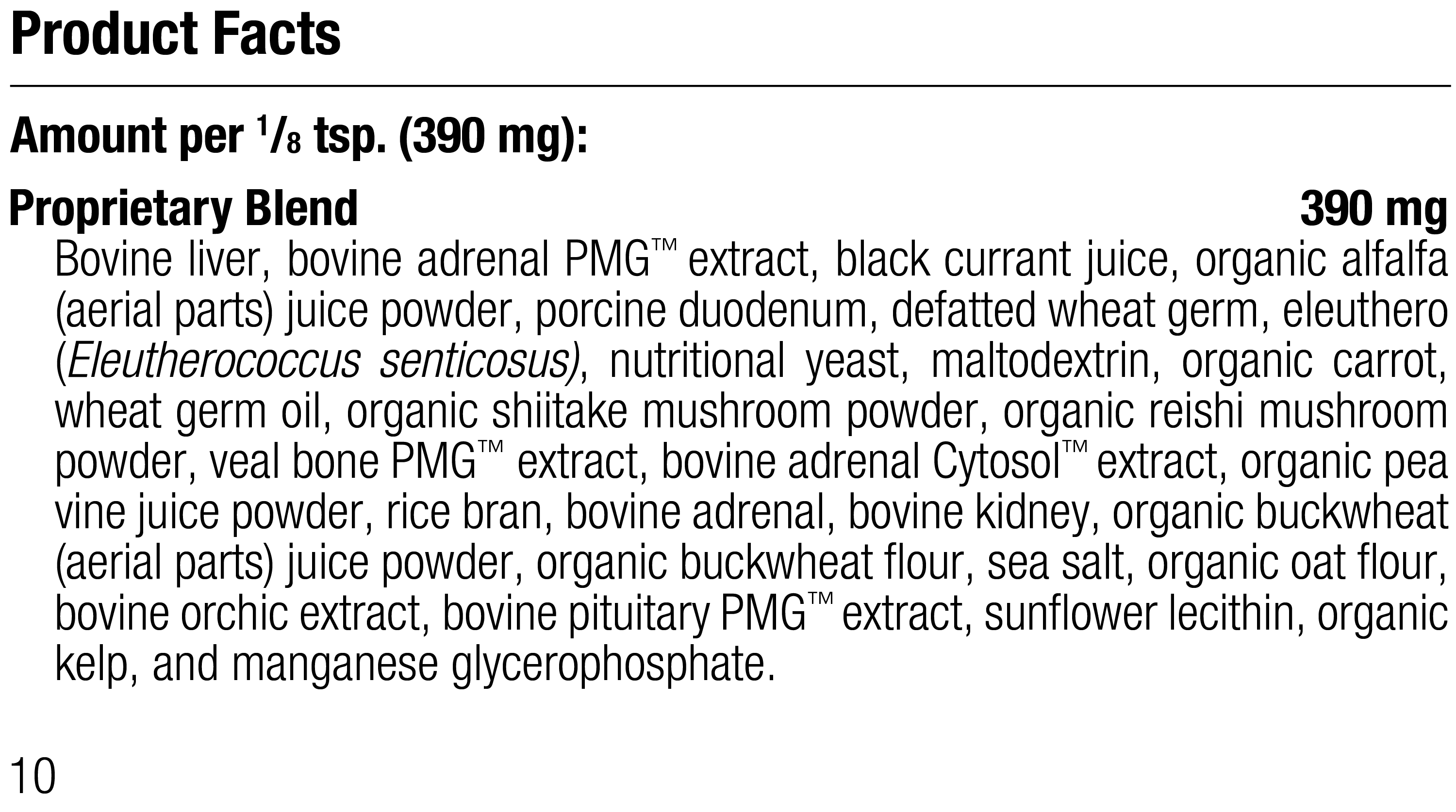 Bovine liver, bovine adrenal PMG™ extract, black currant juice, organic alfalfa (aerial parts) juice powder, porcine duodenum, defatted wheat germ, eleuthero (Eleutherococcus senticosus), nutritional yeast, maltodextrin, organic carrot, wheat germ oil, organic shiitake mushroom powder, organic reishi mushroom powder, veal bone PMG™ extract, bovine adrenal Cytosol™ extract, organic pea vine juice powder, rice bran, bovine adrenal, bovine kidney, organic buckwheat (aerial parts) juice powder, organic buckwheat flour, sea salt, organic oat flour, bovine orchic extract, bovine pituitary PMG™ extract, sunflower lecithin, organic kelp, and manganese glycerophosphate.