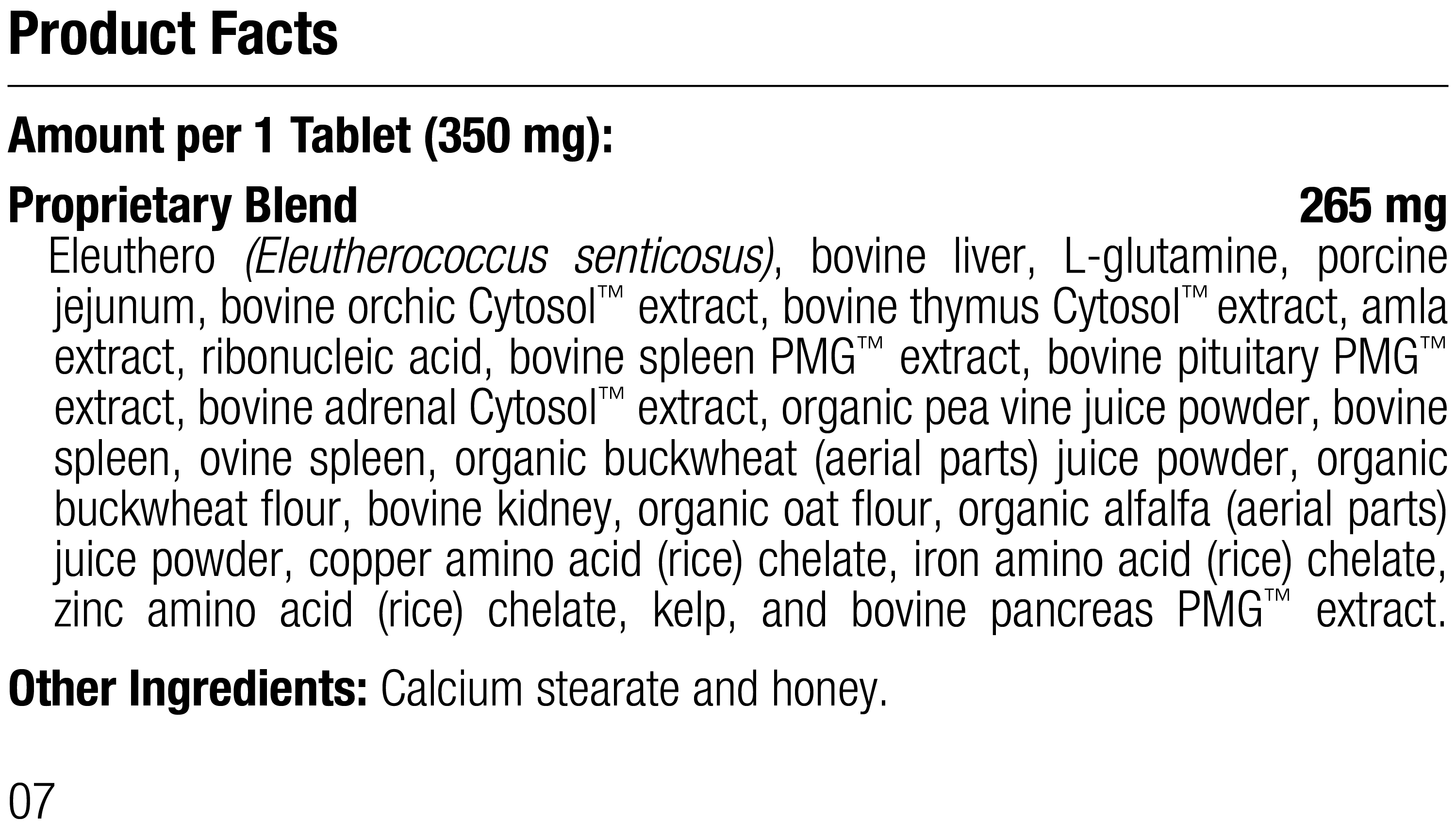 Eleuthero (Eleutherococcus senticosus), bovine liver, L-glutamine, porcine jejunum, bovine orchic Cytosol™ extract, bovine thymus Cytosol™ extract, amla extract, ribonucleic acid, bovine spleen PMG™ extract, bovine pituitary PMG™ extract, bovine adrenal Cytosol™ extract, organic pea vine juice powder, bovine spleen, ovine spleen, organic buckwheat (aerial parts) juice powder, organic buckwheat flour, bovine kidney, organic oat flour, organic alfalfa (aerial parts) juice powder, copper amino acid (rice) chelate, iron amino acid (rice) chelate, zinc amino acid (rice) chelate, kelp, and bovine pancreas PMG™ extract.