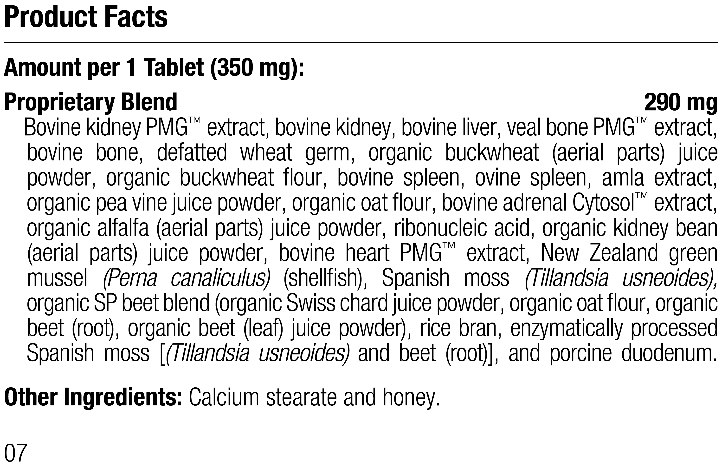 Bovine kidney PMG™ extract, bovine kidney, bovine liver, veal bone PMG™ extract, bovine bone, defatted wheat germ, organic buckwheat (aerial parts) juice powder, organic buckwheat flour, bovine spleen, ovine spleen, amla extract, organic pea vine juice powder, organic oat flour, bovine adrenal Cytosol™ extract, organic alfalfa (aerial parts) juice powder, ribonucleic acid, organic kidney bean (aerial parts) juice powder, bovine heart PMG™ extract, New Zealand green mussel (Perna canaliculus) (shellfish), Spanish moss (Tillandsia usneoides), organic SP beet blend (organic Swiss chard juice powder, organic oat flour, organic beet (root), organic beet (leaf) juice powder), rice bran, enzymatically processed Spanish moss [(Tillandsia usneoides) and beet (root)], and porcine duodenum.